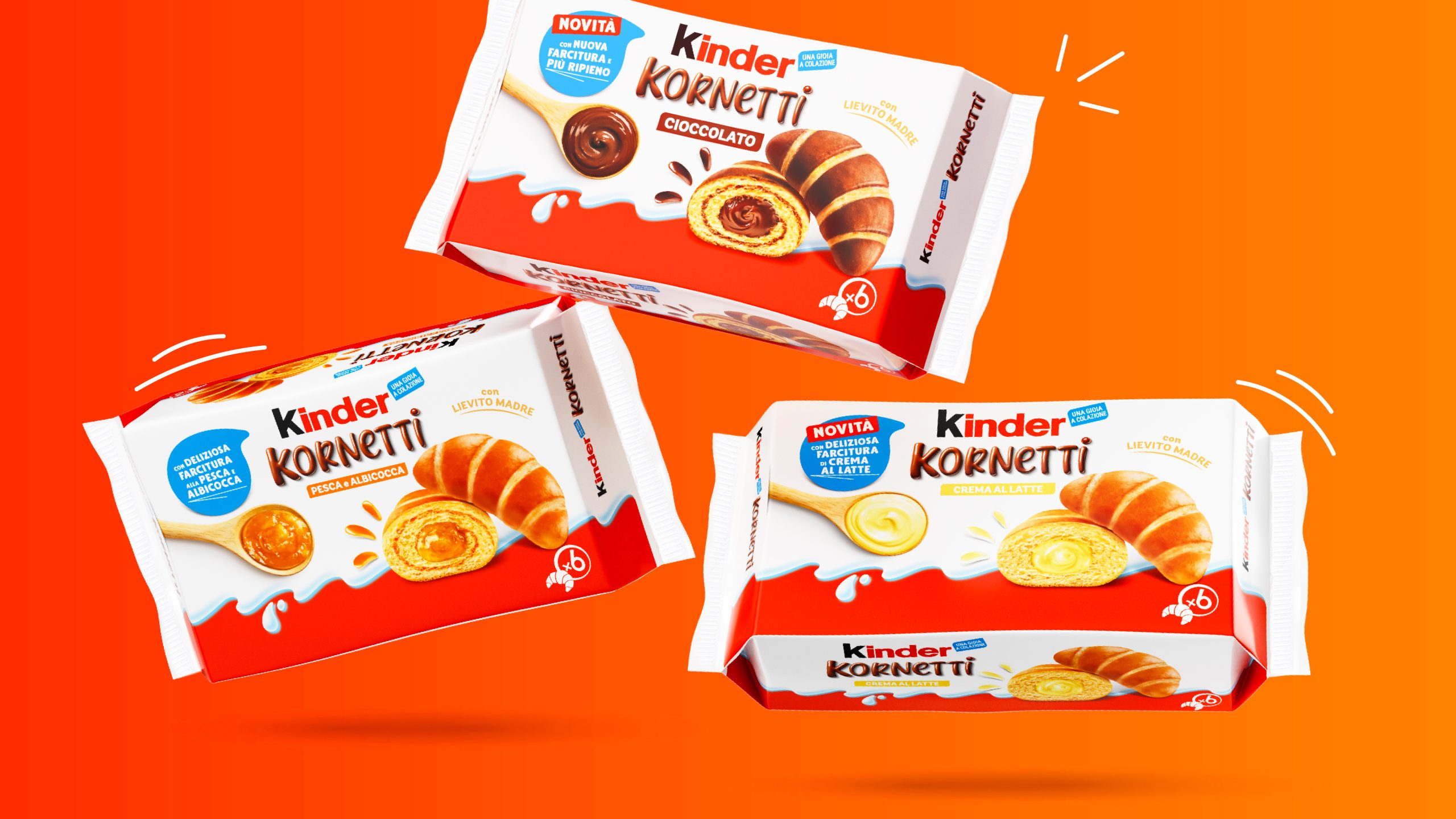 Three years after its market launch, Ferrero decided to revamp the visual identity of the Kinder Kornetti product — previously developed by Wave in 2022 — with the aim of highlighting the recipe change, namely the new and increased filling, while reducing the visibility of the two-tone dough detail, which consumers considered not enough relevant.